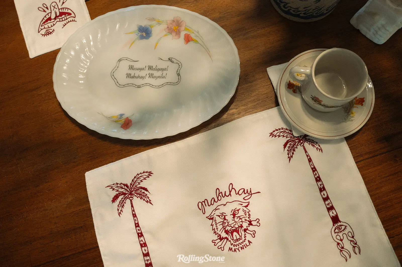 So for now, they’re sticking to a tried and tested formula of doing only small drops. And even after these sold-out partnerships, they always return to themselves as their own “market.” “Because it’s our interest, it’s what we want, we don’t put out products we won’t use,” Alex says as we lounge at their home, peppered with objects from previous releases. A tapestry depicting a King Kong-like beast about to fall prey to a woman warrior covers the edge of the couch, and on the dining table, pristine cotton placemats embroidered with a growling wild cat and two palm trees with mystic symbols for roots.
