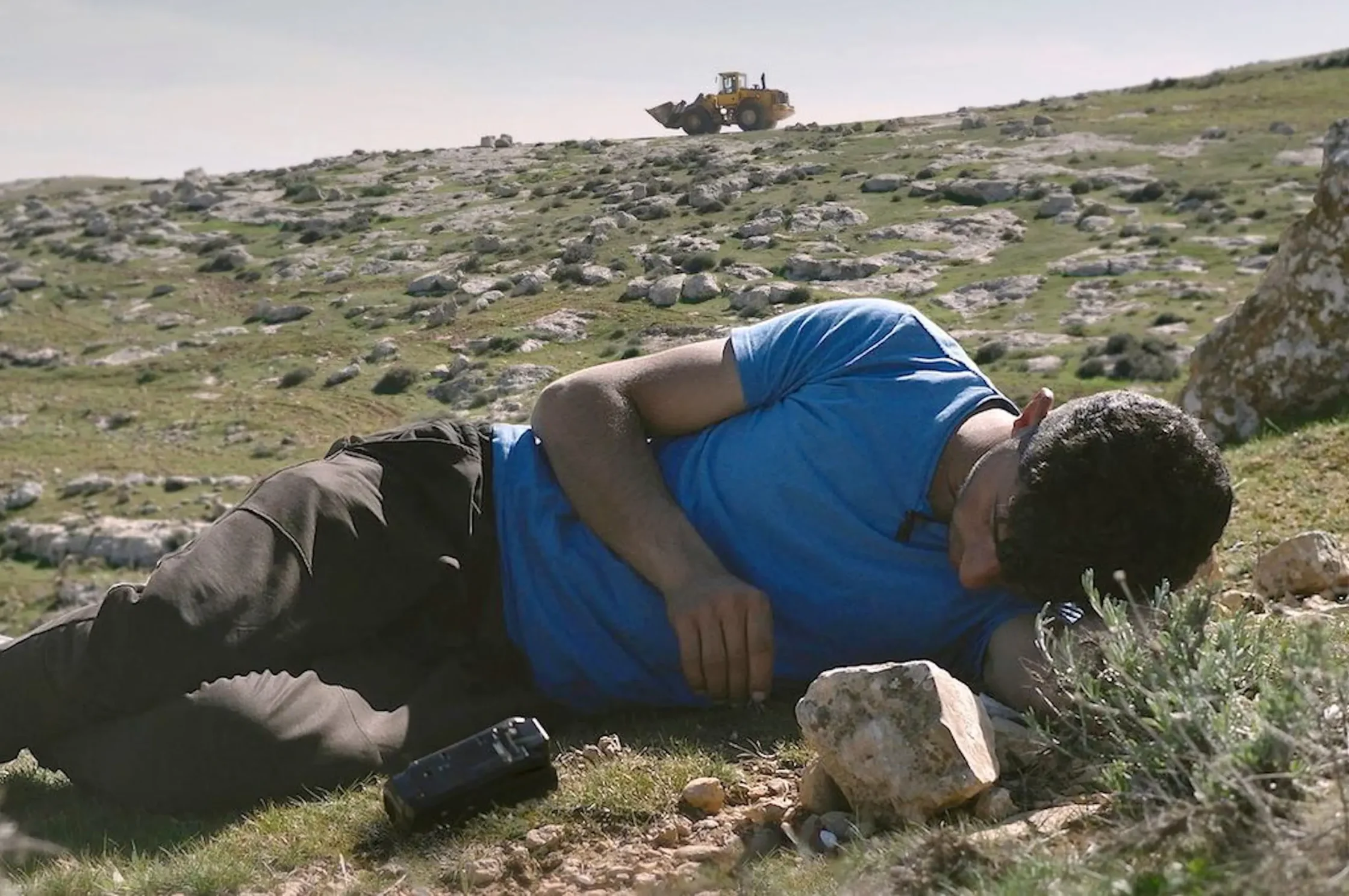 Around an hour and two minutes into No Other Land, our gaze fixates on the film’s subject, Palestinian activist Basel Adra, lying almost in the fetal position on rough terrain, facing away from the sun. He picks gently at spears of grass as his handheld camera — his armor against Zionist erasure — settles on the ground.