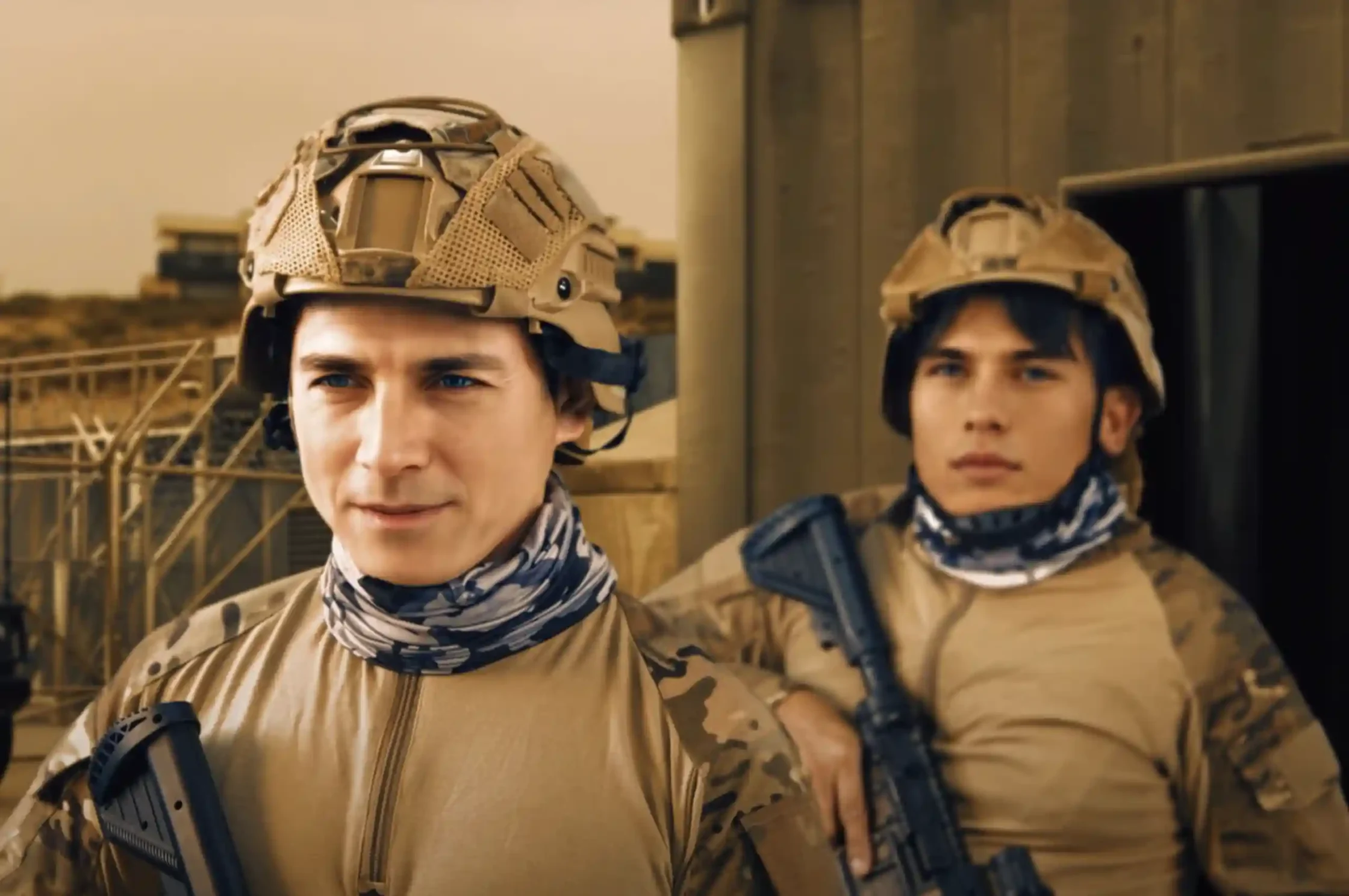 Random shots of vehicles in the desert. A man in military gear exits a vehicle, and there is something off about him, but it’s hard to put a finger on it. Russian model Anastasiia Dymchenko, presumably playing one of the terrorists, says, “We are here to offer you one million dollars.” Pause. “If you join us.” The man replies, “Business. I like that.” Again, there is something very strange about this man. Maybe it’s his delivery? But everyone (from the AI cast to the real actors) has a strange delivery, so whatever.