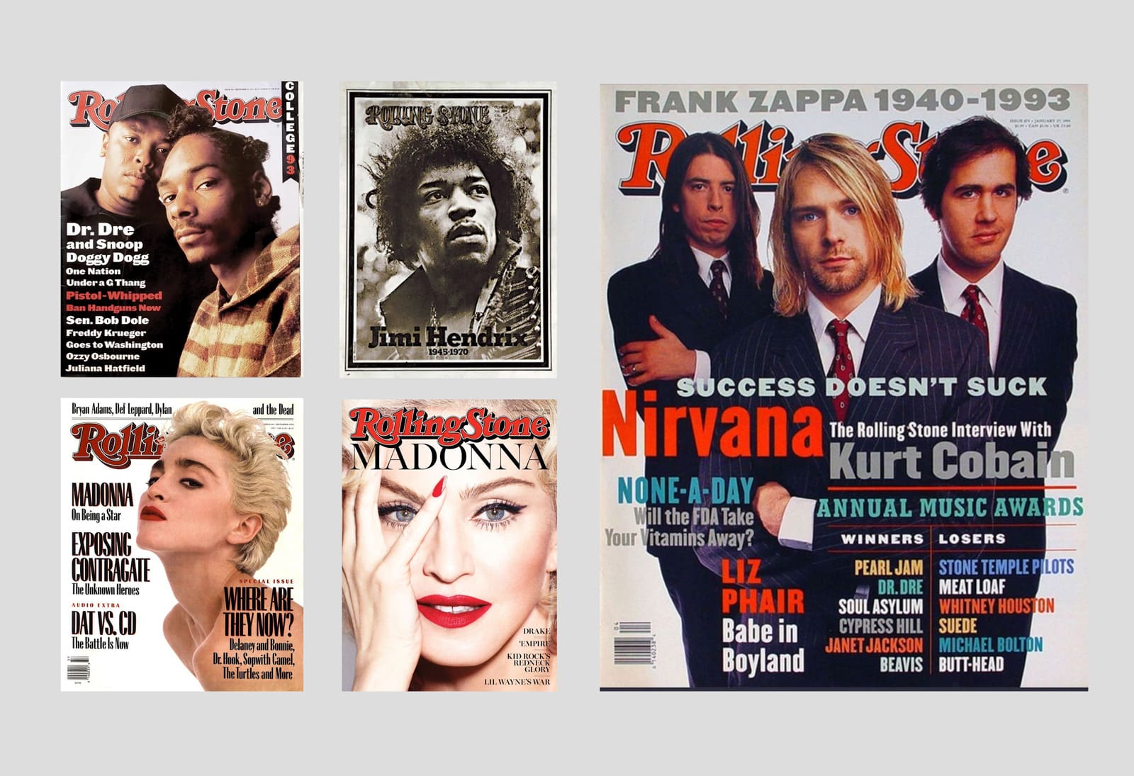 Since that first issue in 1967, Rolling Stone has been the ultimate stage for the biggest music icons, capturing the raw energy, rebellion, and charisma that these musicians bring to their craft. From the legacies of rock stars like Jimi Hendrix and Nirvana, to the electrifying presence of pop sensations like Madonna, to the early days of game-changers like Snoop Dogg and Dr. Dre, each cover captures the essence of what makes these artists legendary.  Whether its the rebellious spirit of the ‘60s or the West Coast dominance of hip-hop in the ‘90s, Rolling Stone has immortalized the most influential figures in music history.