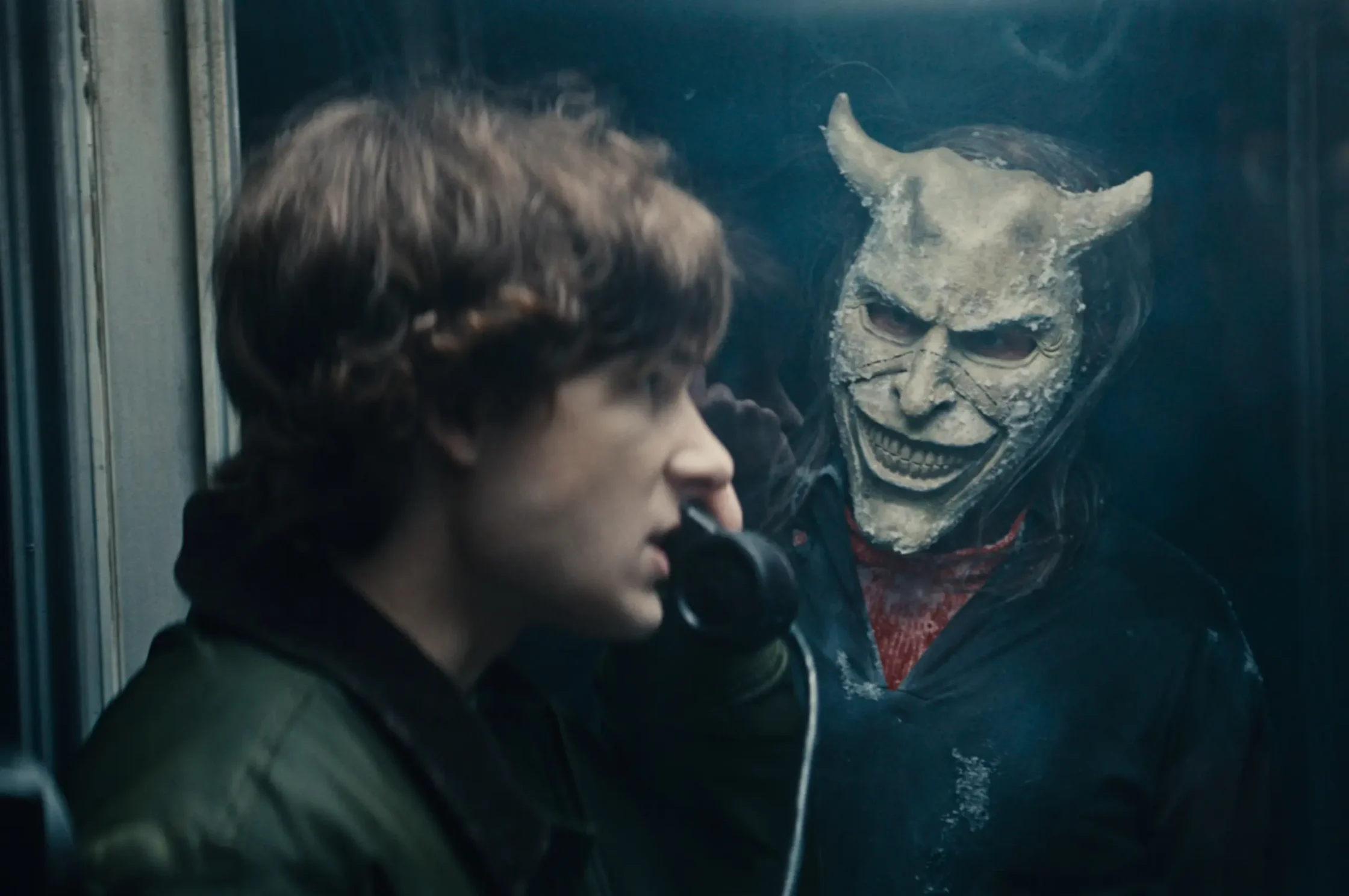 While little is known about Black Phone 2’s storyline, its latest trailer drops a few telling hints. In a series of jarring, grainy clips, we see the familiar dingy basement, children eerily playing in the snow, and the phone ringing once again. What’s more, it appears as if Finney is back in the Grabber’s clutches. Standing alone in a glass telephone booth in the middle of a dark, snowy landscape, Finney answers the phone once again, seemingly reeling from the trauma of his past experience, while the Grabber’s white demon mask presses firmly against the glass.